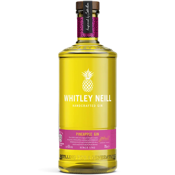 Whitley Neill este un gin produs dupa metode traditionale, din generatie in generatie, incepand cu anul 1762. Se remarca atat prin aparitia spectaculoasa, cat si prin gustul deosebit de ananas alaturi de ienupar delicios, citrice dulci si indici de piper negru. In componenta acestui gin regasim si alte plente botanice precum ienuparul, seminte de coriandru, radacina de angelica, coaja de portocala, lemn dulce sau lamai si mure. Toate aceste ingrediente se contopesc pentru a crea o complexitate si o eleganta remarcabile acestui gin neted, parfumat, foarte bine echilibrat. Poate fi consumat sec sau poate reprezenta baza unor cocktail-uri delicioase.