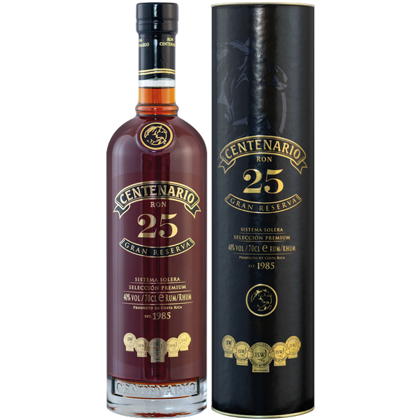 Centenario Ron 25 ani este un rom premium produs in sistem Solera dintr-un mix de blenduri cu varste cuprinse intre 6 si 25 de ani maturate in butoaie de stejar alb american. Prezinta o culoare chihlimbarie cu nuante de mahon si un nas cu note fructate. Gustul surprinde simturile prin arome intense de fructe, vanilie, caramel si note lemnoase. Finisalul este echilibrat si uscat.