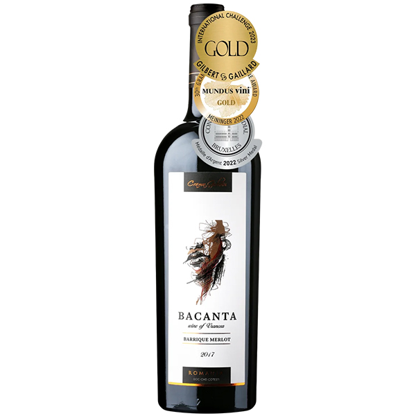 Asemenea mitologiei antice, "Bacanta" reuseste sa isi insuseasca misterul si opulenta gustului bine definit, intr-o formula demna de originea numelui sau. Prin aspect, aroma si textura, acest vin readuce in prim plan esenta mitului. Acest Merlot este maturat in baricuri noi frantuzesti si invechit cativa ani buni in sticla. Gustul este pregnant, cu arome de cirese negre si cacao urmate de condimente cu note dulci de vanilie. Un vin corpolent, cu tanini moi si aciditate modica. Vinul necesita o decantare de doua ore.